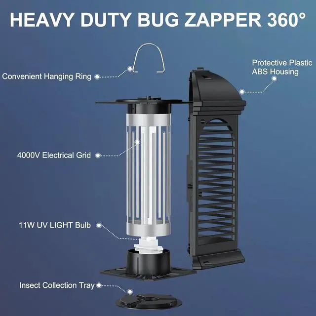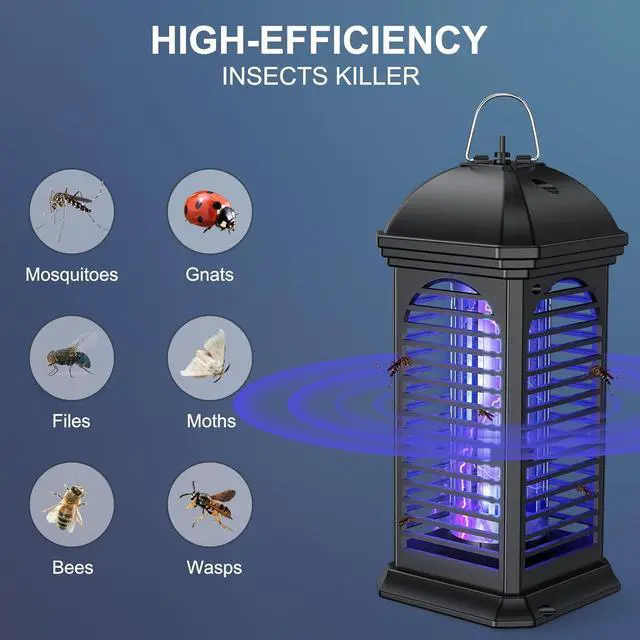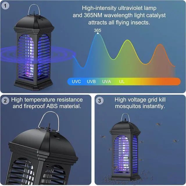 Efficient Mosquito Control The Electric Bug Zapper device uses a UV bulb with a wavelength of 365 NM, utilizing human bionic technology to effectively attract mosquitoes and kill them under high voltage of 4000 V. The expected lifespan of this energy-saving and powerful ultraviolet lamp is 8.500 hours. Our equipment is very effective against mosquitoes, flies, moths, and other flying insects.
