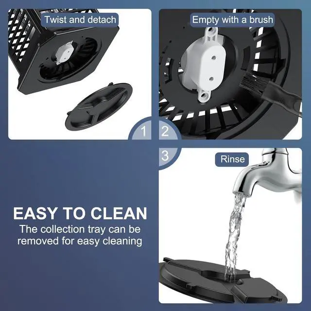 Easy to Operate and Clean The simple electrical plug-in design of the Insect Fly Zapper allows for trouble-free operation virtually anywhere. The mosquito killer has a removable tray and brush for cleaning after heavy use. Simply remove the tray and clean with the brush or rinse with warm water.