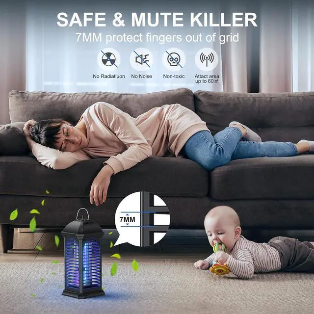 Quiet and non-toxic, Family Safe 100% physical method to kill mosquitoes, flies, moths, and more. No odor, no chemicals, quiet operation, environmentally friendly, safe for pregnant women, children, animals and plants. Bug Zapper Outdoor shell is made of flame retardant ABS material, safe and high temperature resistant. (7mm interval), prevent accidental electric shock.