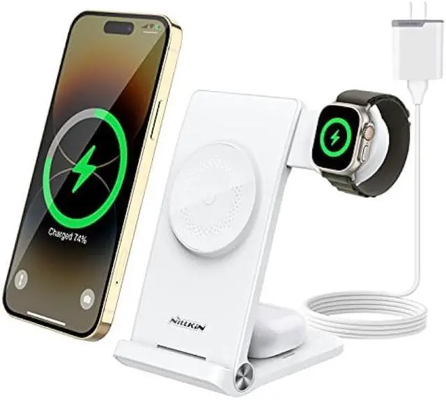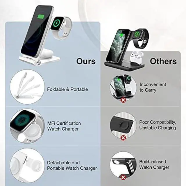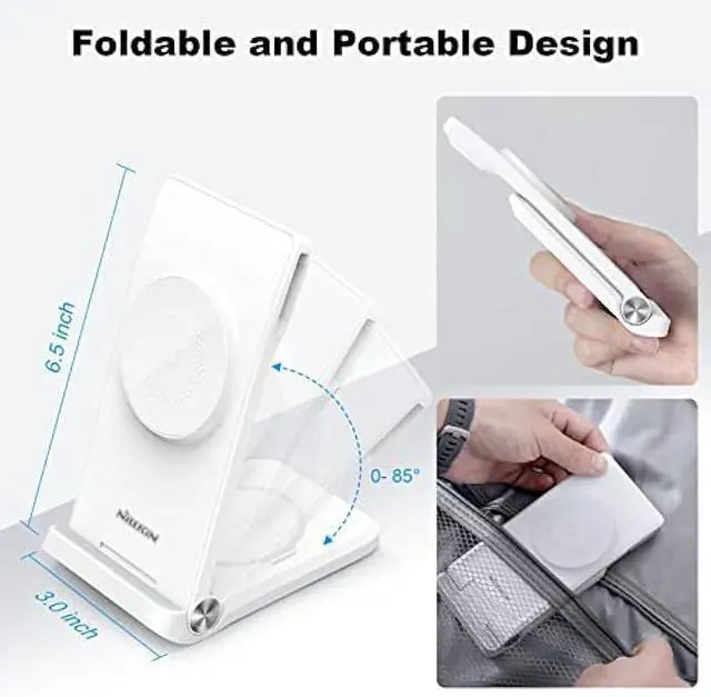 Portable & Foldable DesignWireless charging station for apple is perfect for traveling, nightstand, work desk, making everything look cleaner. Dual coils design allows to charge the phone vertically and horizontally, magnetic charger for iPhone is suitable angle to watch videos or FaceTime while charging.