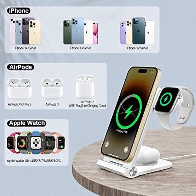 3 in 1 Charging Station for apple Compatible with iPhone 15Pro Max/15 Pro/15 Plus/14/13/12 Pro Max and Qi-supported wireless charging phone, Apple MFI Certification watch charger only compatible with apple watch ultra/8/SE/7/6/5/4/3/2, earbuds charger docking for AirPods 2 (magsafe wireless charging case) / AirPods 3 /Pro /Pro 2.