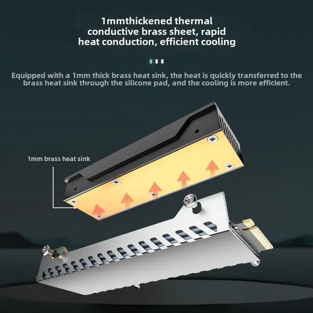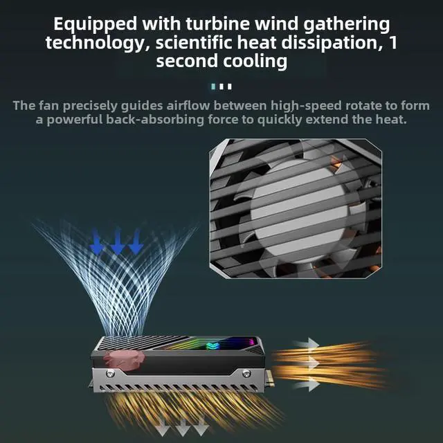 M2F SSD cooling vest built-in large fan strong heat dissipation, and equipped with 1MM thick brass thermal conductive sheet, all-round heat dissipation to protect the hard disk stability use