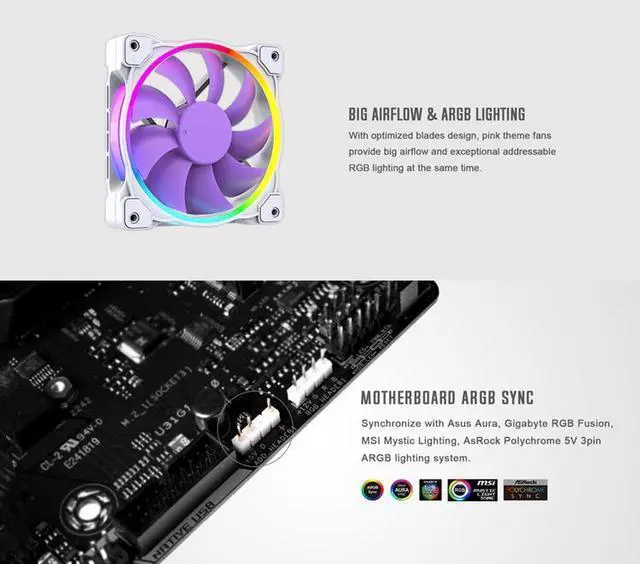 Noise: 16.3 ~ 33.5 dB (A) Versatile RGB Lighting Sync with Motherboard Addressable RGB header, you can always get your favorite RGB Lighting to match your build. Made for those seeking excellent airflow, quiet operation, and powerful lighting. Fan Size 120mm Color Pink LED ARGB