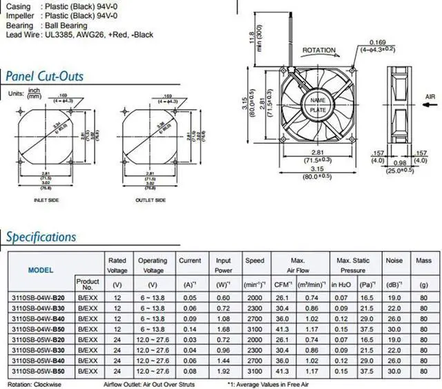 NMB3110SB-04W-B6980mm x 80mm x 25mmDC12V 2 Lead wires