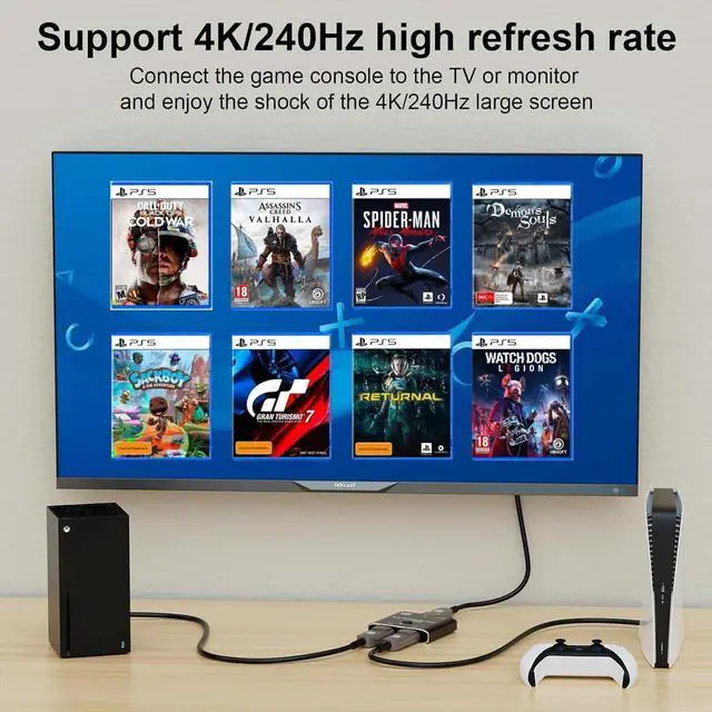 16K DP Switch: Support 8K@120Hz, 4K@240Hz, 1080P@240Hz resolution, provide you with transfer rates up to 40Gbps and backward compatible with all previous DP standards. (You need connect standard DP 16K cable to enjoy visual effects)