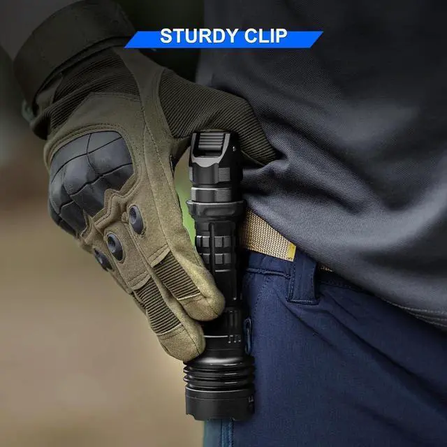 HIGH LUMEN TACTICAL FLASHLIGHTThe tactical flashlight adopts the latest SST40 6500K LED bulb which delivers up to 2000 lumens high output, longest beam throw is up to 1634 feet. It is a professional tactical flashlight.