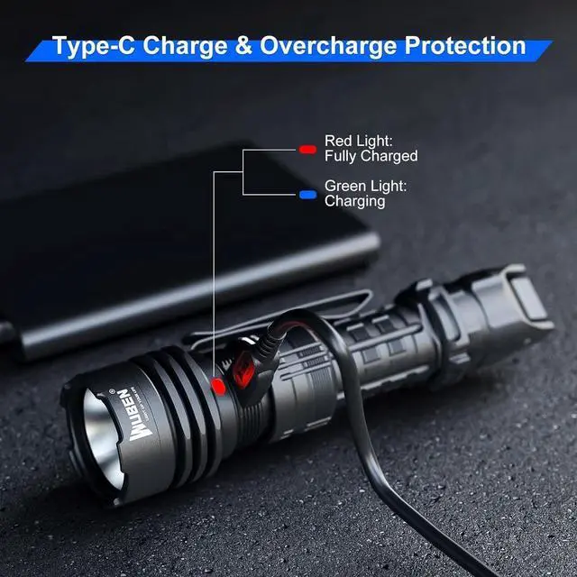 SAFETY AND WARRANTY Flashlight high lumens 2000 high efficiency and large output LED chip with overcharge and overdischarge function, WUBEN tactical flashlight has a 100% satisfaction guarantee and 1 year free warranty service.