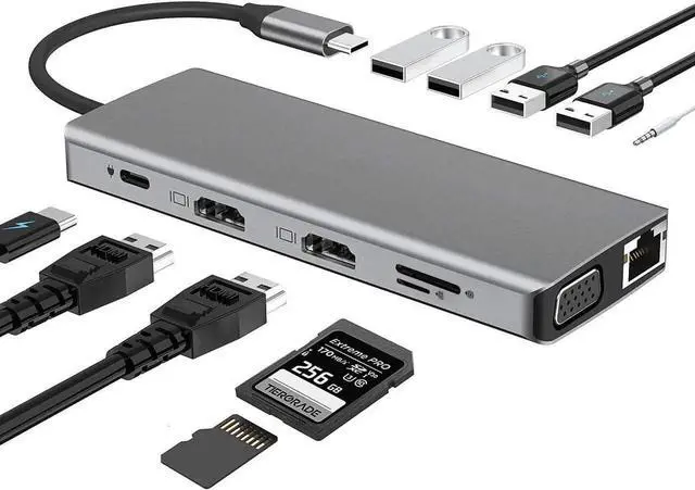 12 in 1 USB C Dock with Dual HDMI, VGA, PD3.0, SD TF Card Slot, 4 USB Ports,Gigabit ethernet, 3.5mm Mic/audio port