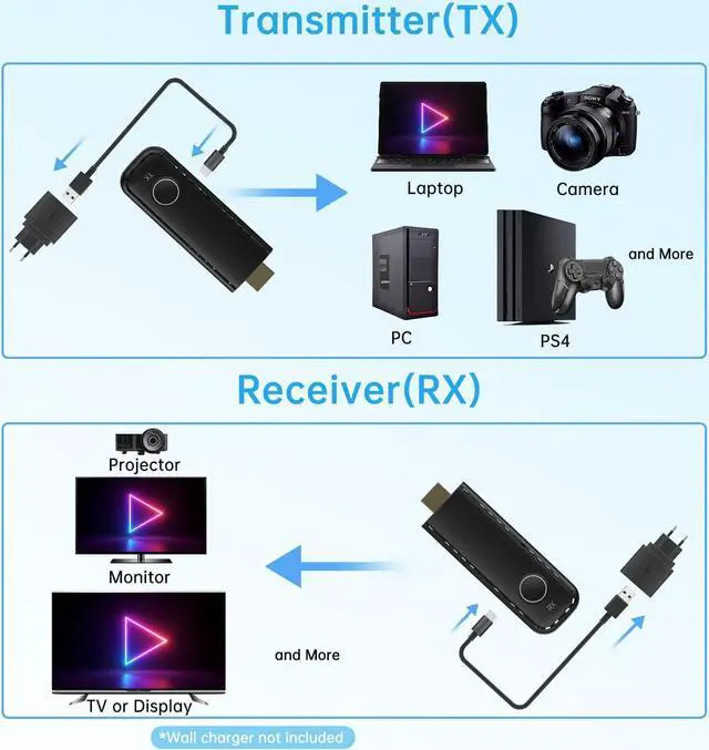 Warm TipsThe receiver (RX) must be powered by connecting the micro USB to a USB port on the monitor or other USB power source (not included). Most laptops are capable of powering device TX directly from the HDMI port. If the device TX is not powered, connect the USB mini-port to a USB source/port. E. g camera.