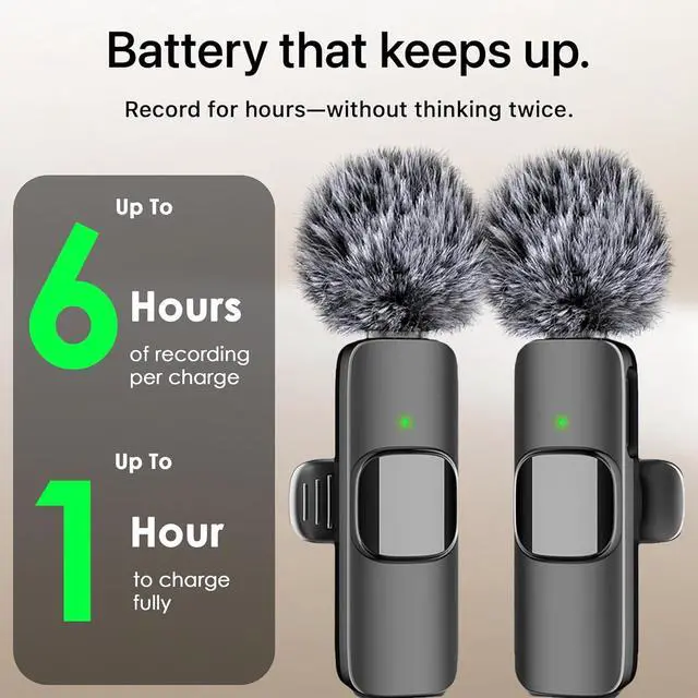 Rechargeable Battery: A wireless lavalier microphone designed for real creators. Record for up to 6 hours per charge. While using the lav mic, you can charge your device simultaneously.