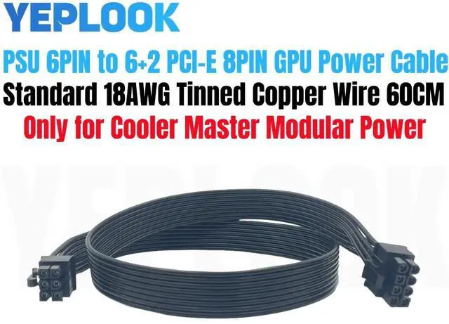 6Pin to 8Pin 6+2Pin PCI-E GPU Power Cable ForCooler Master V850, V1000, V1200, Silent Pro Gold 1200W Modular Power, 18AWG 60 CM