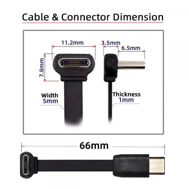 Ultra Slim Flat USB-C Type C to USB-C Power USB 2.0 Data Cable 90 Degree Up Down Angled 65W Fast Charge for Laptop Tablet Phone
