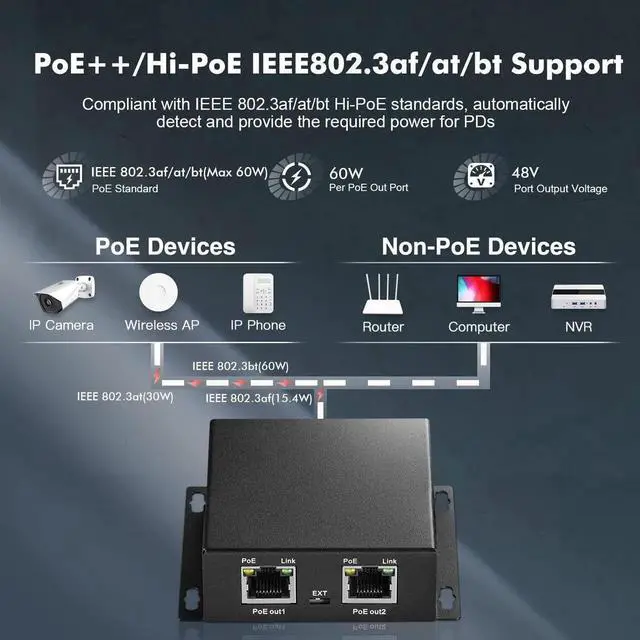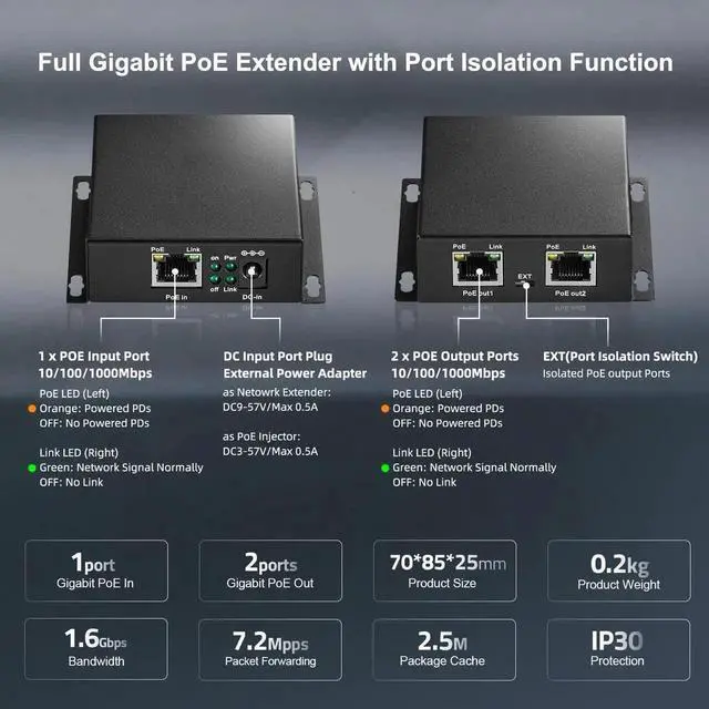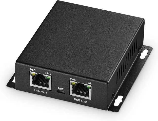 Gigabit PoE PassthroughInclude 1 PoE In 2 PoE Out Ports, 10/100/1000Mbps rate self-adaption. Powered by PoE network, no AC power supply required.