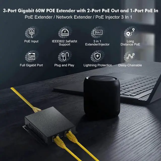 Three in OnePowered by PoE or DC (not inculded). When Input DC 12V 0.5A, as a network extender. When Input DC 37-57V 0.5A, as a poe switch/injector. So it has Three in