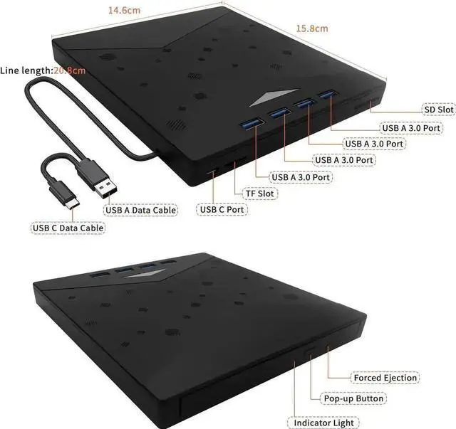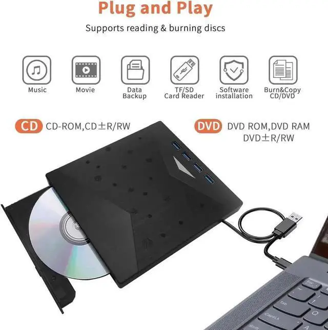 In addition to its CD and DVD capabilities, this device functions as an 8-in-1 USB hub. It offers one USB 3.0 port, three USB 2.0 ports, one TF card slot, one SD card slot, and one USB-C port. This versatile hub allows you to connect USB hard drives, wired or wireless mice and keyboards, computer cooling fans, and other USB accessories to enhance your computing experience.