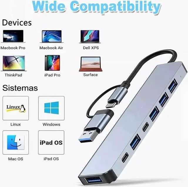 Broad Compatibility and Wide Appliaction: Our 7-port USB Extender hub can work with various usb type-c and usbevices, including laptops, tablets, and smartphones from popular brands like Apple, Dell, HP, Lenovo, and more. The plug-and-play design ensures easy installation and use, without the need for additional drivers or software. Including MacBook Pro/MacBook Retain/MacBook Air or devices with a Type C portWindows 10, MacOS X, Android, Chrome OS Google (Up), Linux with the latest updates day. Also for laptops, tablets, smartphones, pc tower, XBOX, PS4, flash drive, keyboard, mouse, card reader, HDD, cellphone OTG adapter, printer, camera, USB fan or any other USB Peripherals.