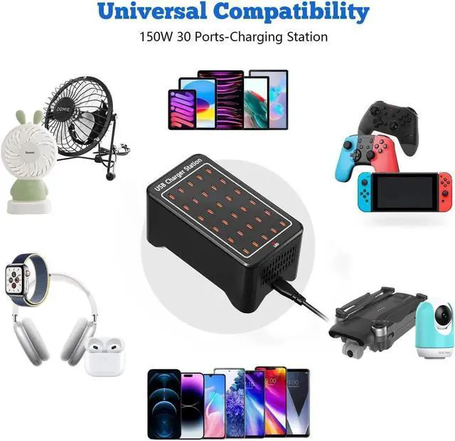 High-Speed Charging Station: With a total output of 150W (30A) this charger provides rapid charging for smartphones cell phones tablets and other USB C-powered devices. 30 port usb c charger block Each port can be charged up to 5V/ 2.4A or 30A overall and the total output power is 150W.