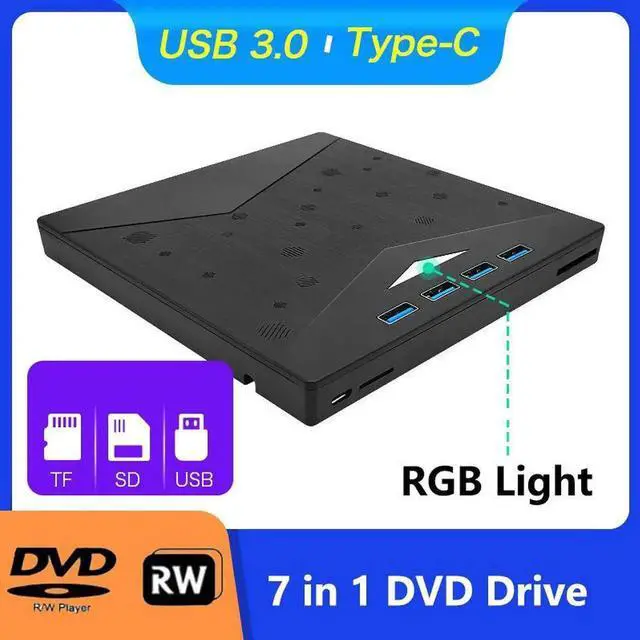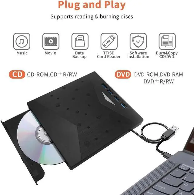 In addition to its CD and DVD capabilities, this device functions as an 8-in-1 USB hub. It offers one USB 3.0 port, three USB 2.0 ports, one TF card slot, one SD card slot, and one USB-C port. This versatile hub allows you to connect USB hard drives, wired or wireless mice and keyboards, computer cooling fans, and other USB accessories to enhance your computing experience.