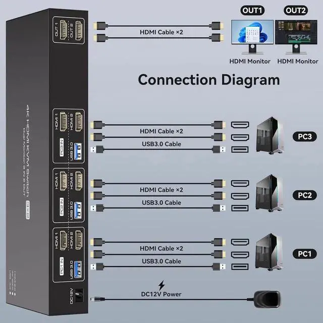KVM Switch 2 Monitors 3 ComputersThe KVM switch 3 Computers allow you to control 3 computers by only one set of keyboard mouse, share 4 USB 3.0 devices and 2 monitors. The kvm switch support extended & copy mode, click "Windows+P" to select "Duplicate" Mode or "Extend" Mode. Note: For dual-screen functionality, please make sure your computer has 2 graphics cards. Pre-Purchase Notes: 1. Please make sure both of your computer or dock station has 2 HDMI Ports + USB-A Port. 2. Please make sure both of your monitors have an HDMI Port. 3.HDMI to DP or HDMI to DVI/VGA cable are not recommended