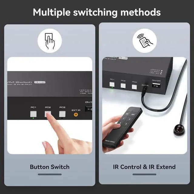 2 Switching ModeKVM dual monitor HDMI support switch between 3 computers through wireless controller (included) or panel button.Switch mode 1:use the wire Desktop controller,the layout of machines and cables can be hidden to make the office desktop more tidy.Switch mode 2:the device's main panel features a built-in switch button, simply press it gently to switch between the three computers. Let you can save more time to do other things!NOTE: Keyboard shortcuts (hotkeys) toggles are not supported