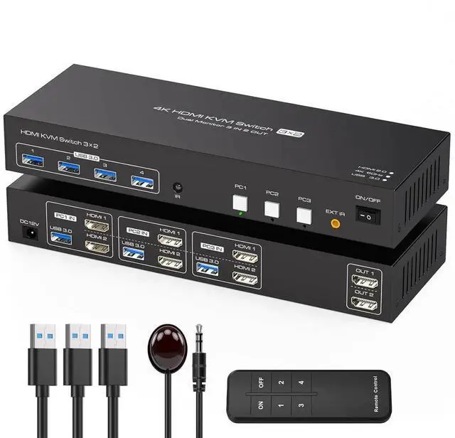 IHDAPP HDMI KVM Switch 3 Computers 2 Monitors, 4K@60Hz EDID Simulation HDMI 2.0 KVM Switch 3 in 2 Out for 3 Computers Share Dual Monitors and 4 USB 3.0 Devices with USB Cable and Remote Control