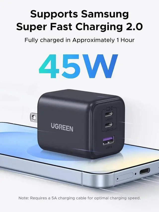 Supports 45W Super Fast Charging 2.0Just 30 minutes of charging provides enough power to last through a full day of use. Specifically, this 3-port fast charger can charge your iPhone 17/16 Pro Max or Galaxy S25/S24 Ultra to about 67% in 30 minutes, eliminating battery anxiety.
