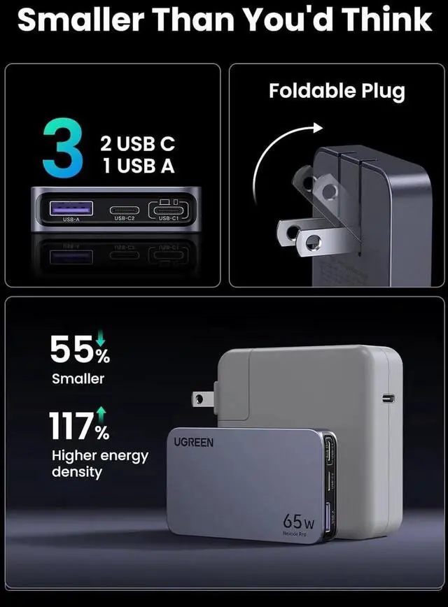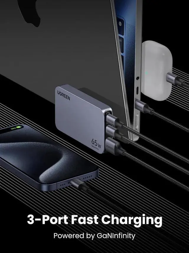 3 in 1 Charger for More Devices: UGREEN 3-Port 65W USB C charger provides an enormous 65W of charging power, that's enough to fast charge your phone, tablet, and laptops from a single charger
