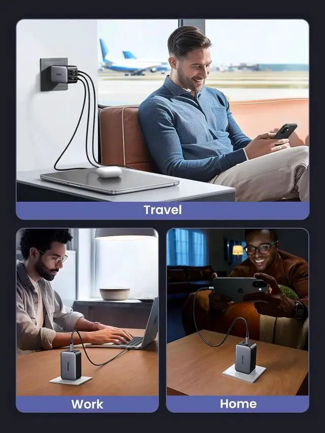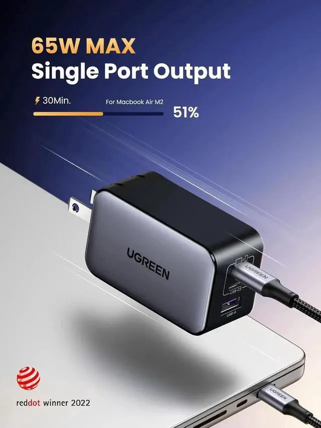 Travel Friendly, Compact Design: Thanks to a cutting edge GaN chip, Ugreen's 65W USB C charger is 50% smaller than the original 61W USB C charger; A foldable plug provides more portability and a better travel experience