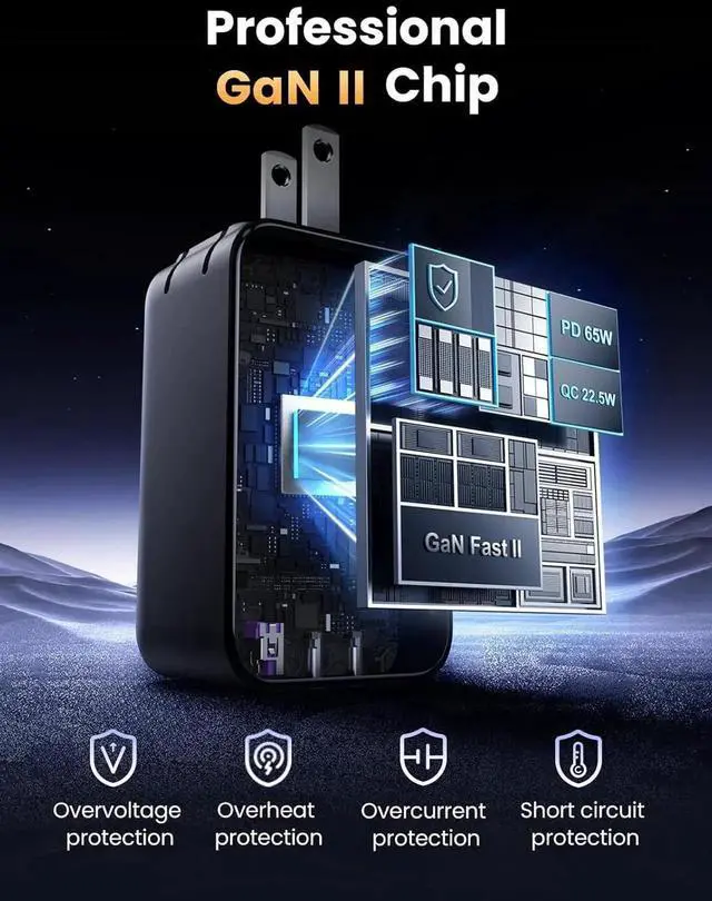 Adopted GaN Safety & Efficiency: Utilizing GaN technology, this 65W power adapter provides safe, cooler charging to protect your devices while optimizing energy usage