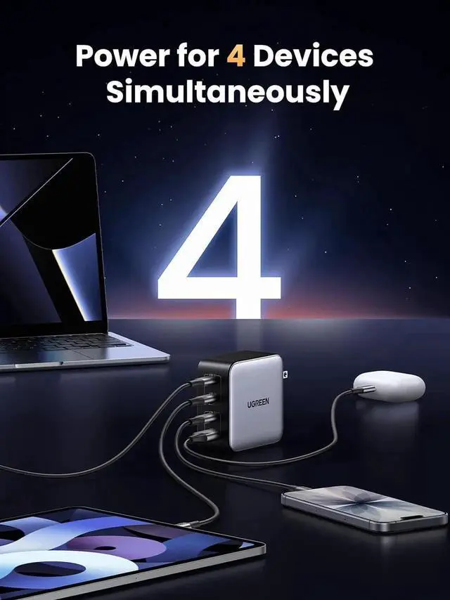 4 In 1 Multiport charger: 3 * USB C ports and 1 * USB A port provide 100W to phones, tablets, laptops, and other devices, all at the same time fast charging