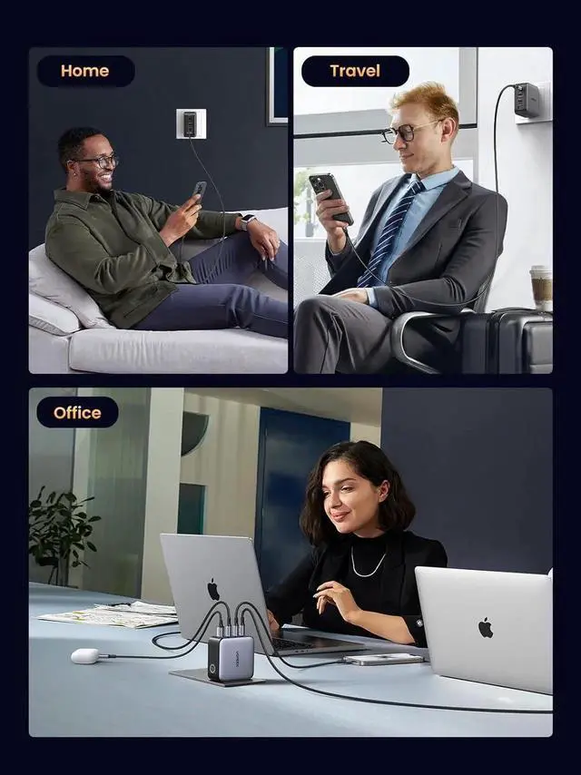 Portable, compact design: A GaN chip combined with foldable plug design makes this 100W charger small enough to fit in the palm of your hand without a sacrifice in quality or power, very suitable for long distance travel or business trips