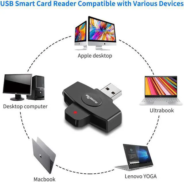 Le Rocketek USB Multifonction Lecteur de Carte À Puce est un outil facile à installer périphérique USB compatible avec pratiquement tous les contacter cartes à puce, systèmes d'exploitation, et une variété d'applications, y compris la banque en ligne et numérique signatures.