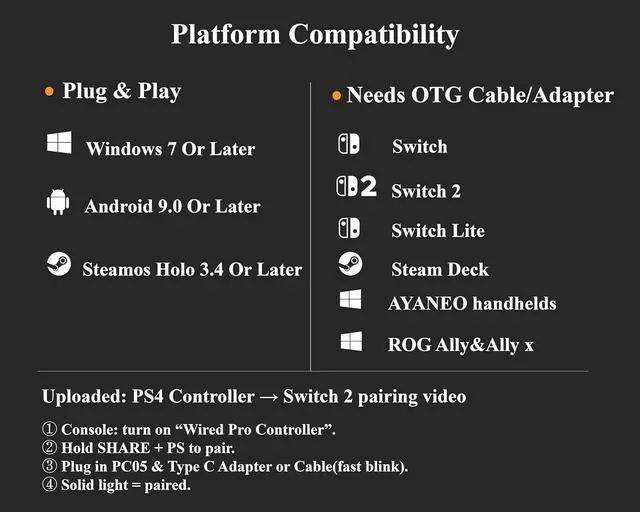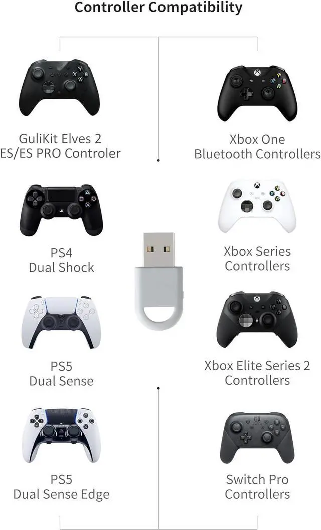 WIDE COMPATIBILITY:The controller connector is compatible with a rang of controllers, including for Xbox One Bluetooth,Xbox Series,Xbox Elite Series 2(Not for The Xbox One released betweern 2013 and 2015 & the Xbox Elite wireless controllers which without Bluetooth function),for PS5 Dual Sense Edge,PS5 Dual Sense,PS4 Dual Shock, Switch Pro, GuliKit elves 2/ES/ES PRO. It supports a variety of platforms, including Windows 7+, Android 9.0+, Switch, Switch 2, and SteamOS 3.4+.For Switch 2,enable "Wired Pro Controller Connection" in the System Settings.(For use with Switch Lite/Switch 1/2,Steam Deck / AYANEO handhelds/ROG Ally&Ally X, you need an additional OTG cable or adapter.)