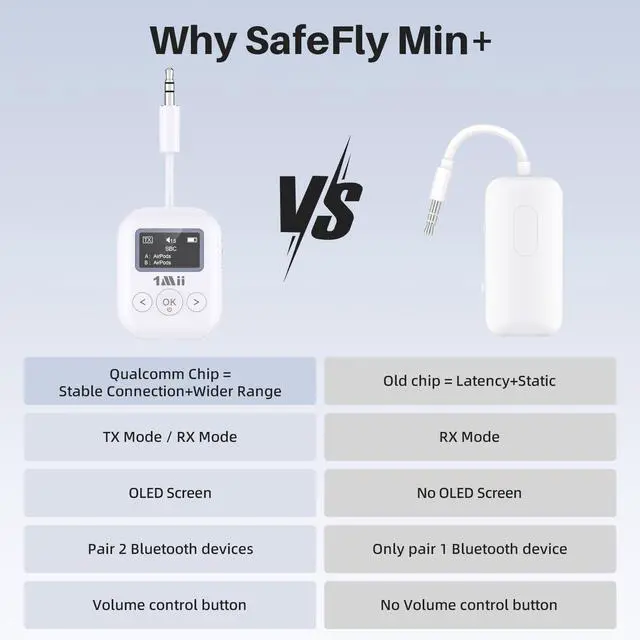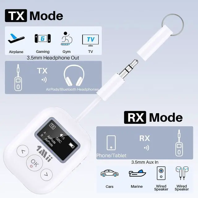 1Mii SafeFly Min+ 2 in 1 Bluetooth transmitter and receiver with LOED screen, it supports dual link, allowing you enjoy watching movies or listening music with your friends and family. With the aptX low latency technology, you can use the 1Mii Bluetooth transmitter to connect your TV/ airplane entertainment with your Bluetooth headphones without worrying about voices not match lips while watching movies. You never worrying run out of the battery with this rechargeable Bluetooth audio headpones adapter.
