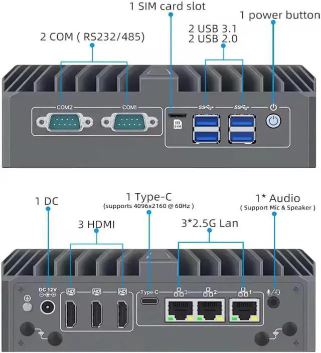 I/O: 2 x COM RS232/485, 1 x SIM slot, 2 x USB 3.1, 2 x USB 2.0, 1 x Power button, DC, 3 x HDMI, 1 x Type-C, 2 x USB 2.0, 3 x 2.5G Lan, 1 x Audio(Support Mic & Speaker at the same time)