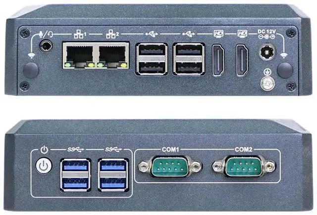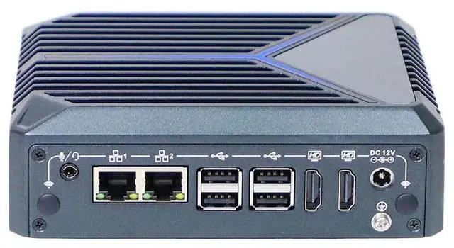 I/O: 1 x Power Switch, 4 x USB 3.2, 2 x COM (RS232/RS485), 1 x DC, 2 x HDMI, 4 x USB 2.0, 2 x RJ45 network ports, 1 x Audio two-in-one port