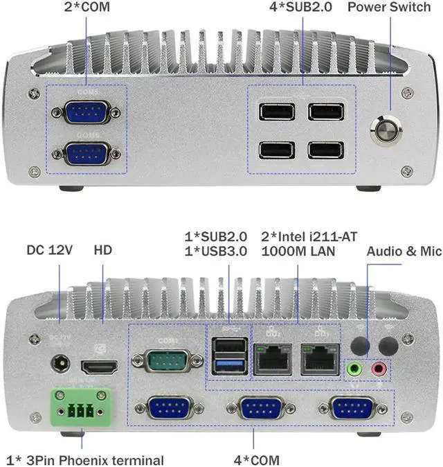 I/O Port: 1*USB3.0, 5*USB2.0, 1*HD-MI, 2*1000M Lan, 1*Mic, 1*Line Out, 1*Power Switch, 6*COM (COM1, COM2 support RS232/RS485 optional), 1*DC-IN 12V