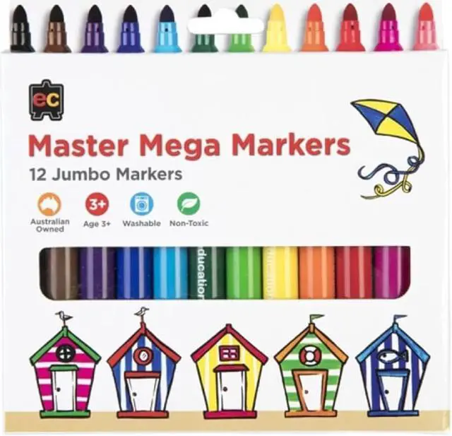 Educational Colours Master Mega Markers are perfect for young artists featuring jumbo barrels that are easy to hold. These washable Master Mega Markers are safe for children with non-toxic, water-based ink and child safe ventilation caps. These markers feature broad tapered tips for both bold strokes or fine lines. The Master Mega Markers feature 5.8mm sink-resistant nibs that are engineered to sustain heavy pressure when colouring. 12 vibrant colours in the range. Perfect for the young aspiring artist to express their imagination!