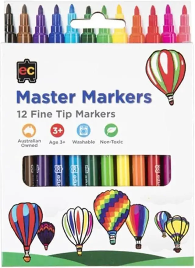 Educational Colours Master Markers lay down bright and radiant colours! These washable markers are child safe with non-toxic, water-based ink and child safe ventilation caps. Each marker has a durable, fine, 2.6mm sink-resistant nib making them perfect for drawing detailed images. 12 vibrant colours in the range. Perfect for the young aspiring artist to express their imagination!