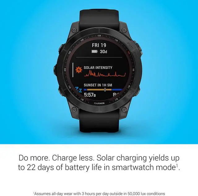 Get up to 18 days of battery life in smartwatch mode with an additional 4 days when solar charging3 — and up to 57 hours in GPS mode with an additional 15 hours when solar charging <