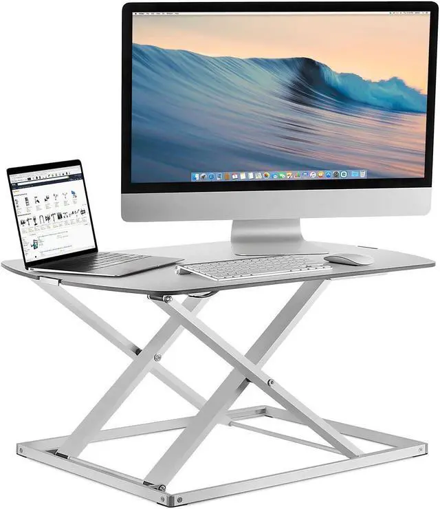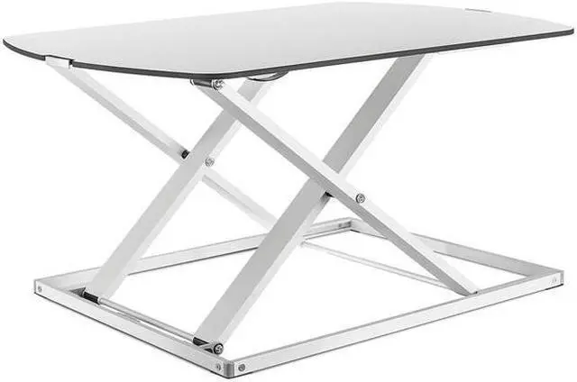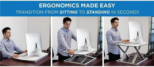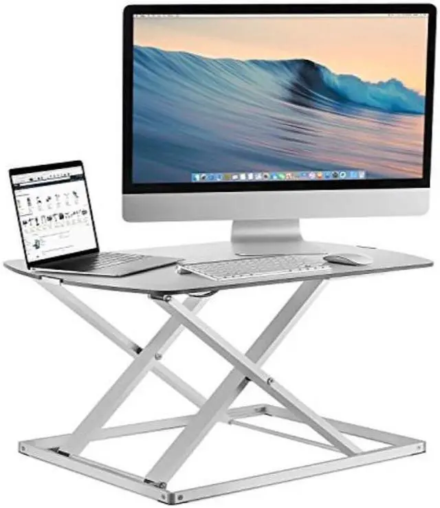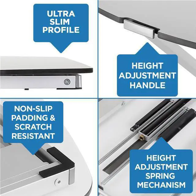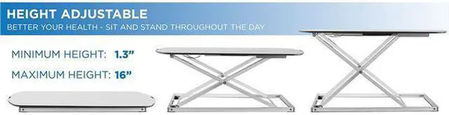 Features and Specifications: Innovative gas spring mechanism allows you to switch between sitting and standing in seconds. Gas spring assist mechanism allows you to raise the desk and your computer with minimal effort. Designed for ergonomic comfort, reducing neck and back strain. Premium white tabletop and silver/grey aluminum legs complement your stylish office. 31.25 x 22 inch extra large surface area is large enough to supporting a laptop and a monitor, keyboard, mouse and anything else you have at your computer workstation. Height from 1.3 to 16 inches, you can adjust the table to your desired position without preset height levels. Rubber anti-slip padding keeps the desk steady and prevents scratching your tables. No assembly required. Comes fully assembled. Just open the box and place it on your desk.