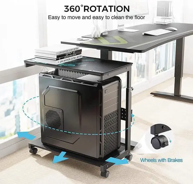 Mobility and Stability: Four 360-degree rotating mute wheels (w/ brakes) enable smooth movement on the carpet. Mobile design allows for easier use in home and office even when fully loaded, reducing carpet prints and indentations, and easy to clean the floor. Dual casters with brakes hold the PC stand firmly in place for stable performance