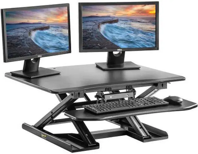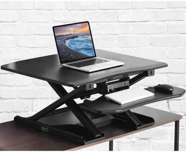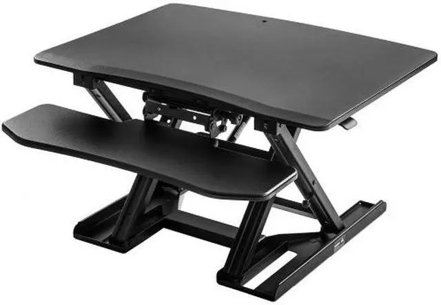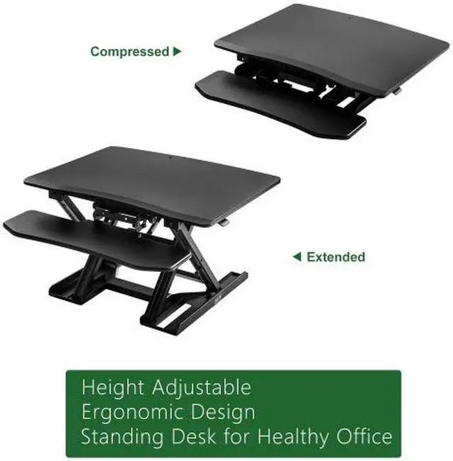 Key Product Features: The Adjustable Standing Desk is a modern solution to combat a sedentary lifestyle, allowing you to alternate from sitting to standing in seconds using state of the art spring adjusting technology to accommodate your daily needs at your workspace. Manufactured to act as an extension to a standard sitting desk, the adjustable standing desk is a portable accessory that is designed to enhance the overall functionality of your desk and general workspace. Outfitted in a sturdy metal frame and reinforced with powerful spring support, this model has a smooth height adjustment feature, leaving the user able to easily transition from sitting to standing at their convenience. Many office jobs involve sitting at a desk being relatively immobile for several hours while working. Having the option to alternate between sitting and standing can allow for a variety of health benefits such as increased blood flow, better posture and sharper thinking to help enhance your overall work experience. With a built-in two tier structured design both your computer and keyboard can be raised at a height tailored to your preferences for comfortable standing, allowing you to free up valuable desk space and reap health benefits all at the same time.