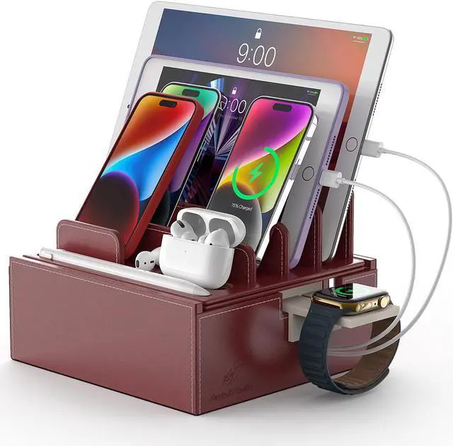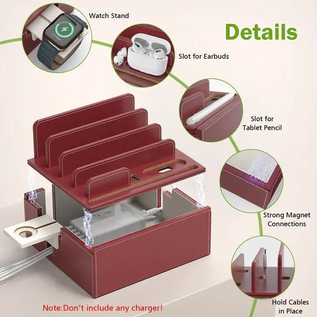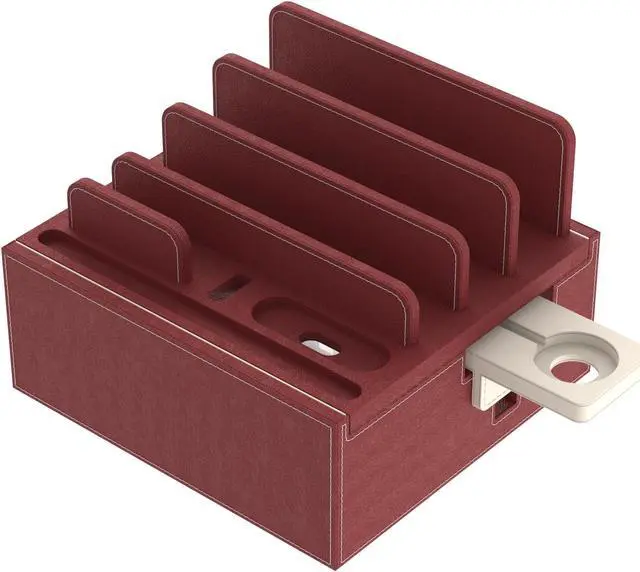 No more tangled wires or frustration charging your devices. Keep your cords and chargers safely tucked away with this sleek leather charging stand. Your nightstand or desk will stay clean and tidy while you wake up with your devices always fully charged.