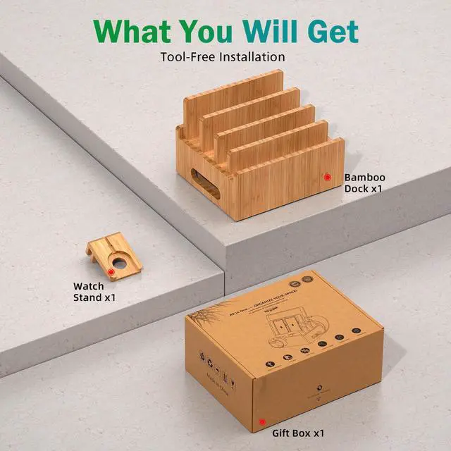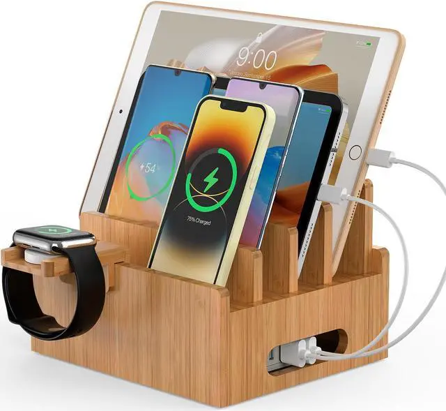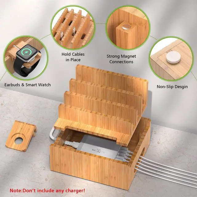 100% natural bamboo charging station stand can hold up to 8 devices (such as iPhone, Smartphone, Samsung Galaxy, Nexus, Apple Watch, AirPod, etc) simultaneous maintaining your devices in order and helps to clean up the stacking device charging.
