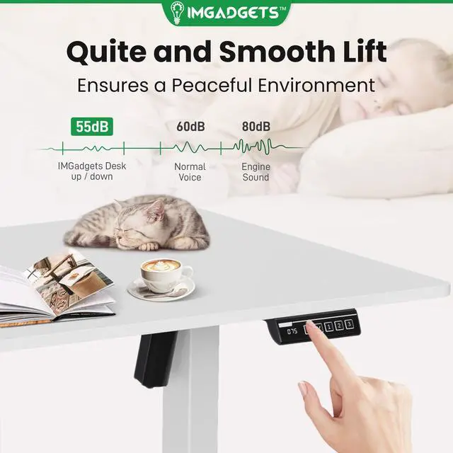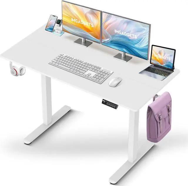 IMGadgets Standing Electric Adjustable Desk | Large Workspace with 2 hooks | Ergonomic Sit-Stand Desk | 3-Memory Settings | Scratch-Resistant & Waterproof | Quiet Operation <55dB 47" x 24" White