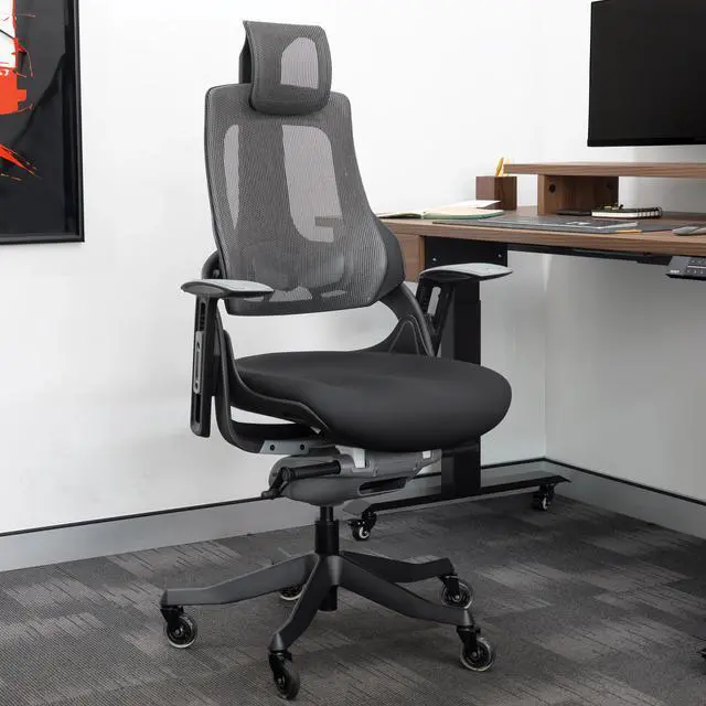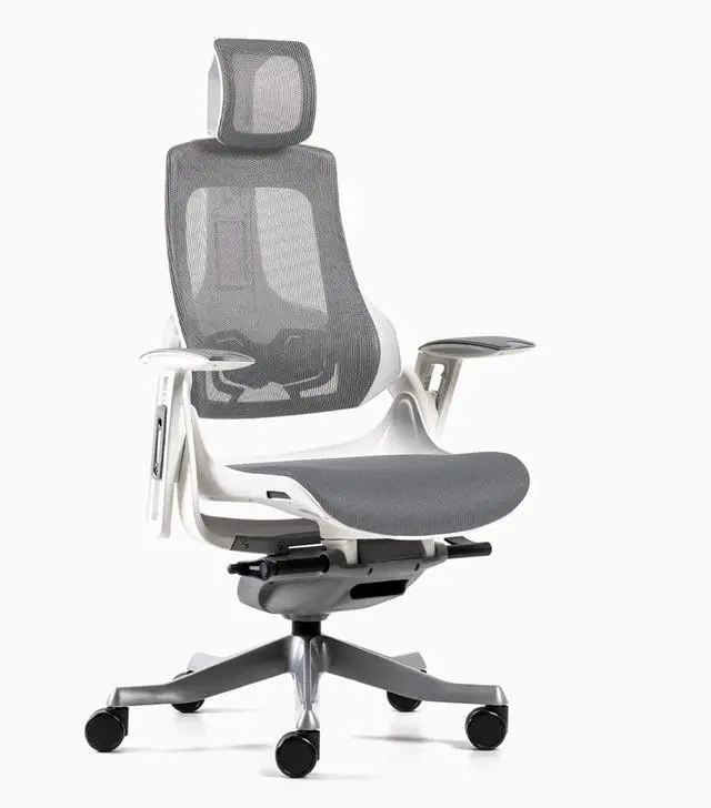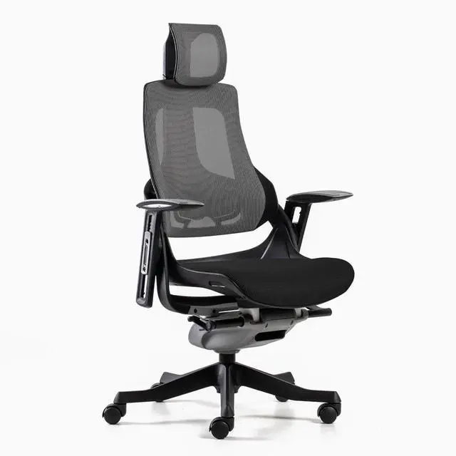Sitting on soft, yet durable black or grey fabric, the waterfall edge of the seat and knee-tilt with tension control, lowering the seat from a point at the front (your feet remain firmly on the floor as your work), mean pressure on the back of your legs is a thing of the past. The mesh back is breathable and you can work in comfort for longer. Deskys elegant, high-back chair comes with a slick black frame, charcoal mesh back and a black powder-coated aluminium base. Also available in white, a supportive headrest completes this simple ergonomic upgrade.