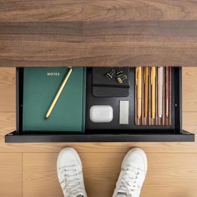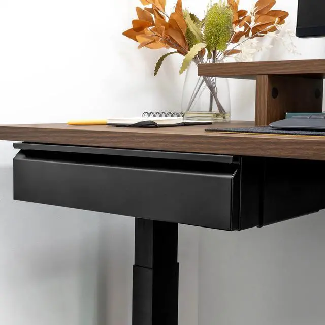 Measures 20.2 wide, 18.9 deep and 7.4 tall, which should be enough for any items you need to keep out of sight but close to hand. The drawer slides out from beneath the desk, and is made from steel for strength. Make more desk space!