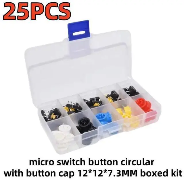 25PCS micro switch button circular with button cap 12*12* 7.3MM boxed kit with five red blue green black white button each color