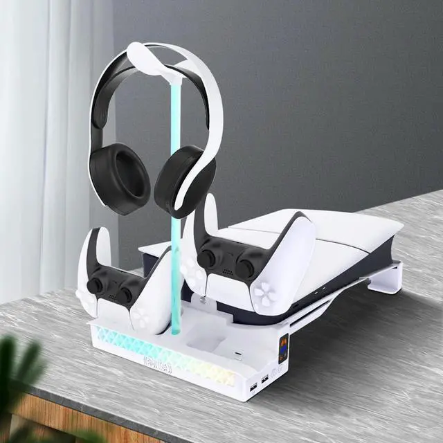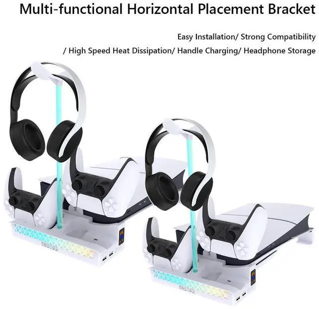 Cooling Stand with Dual Controller Charger Base Stand for PS5 Slim Console for 5 Slim Disc & Editions